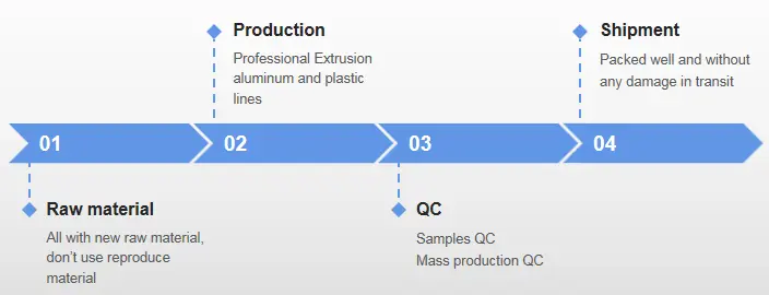 A JE mindig a termékminősítésre összpontosít, az alumínium és a műanyag nyersanyagoktól az extrudálási gyártósorig, a minták minőség-ellenőrzésétől a tömegtermelés ellenőrzéséig, az erős tökéletes csomagtól az egész szív-szolgáltatásig.